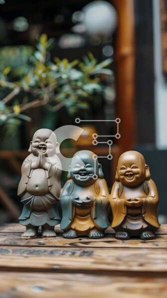 Intra Συλλεκτικό Ξύλινο Παζλ Plywood 4mm – Τρία χαμογελαστά ειδώλια του Βούδα σε ξύλινο τραπέζι Σε Ξύλινο Κουτί – Διαστάσεις: 10×10 cm – 25 κομμάτια