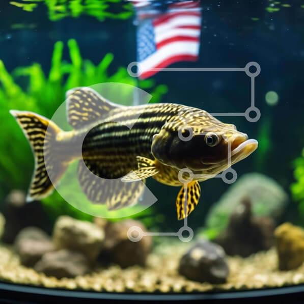 Intra Συλλεκτικό Ξύλινο Παζλ Plywood 4mm – Υγιή ψάρια που κολυμπούν στο ενυδρείο με φόντο την αμερικανική σημαία Σε Ξύλινο Κουτί – Διαστάσεις: 10×10 cm – 25 κομμάτια