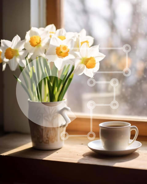 Intra Συλλεκτικό Ξύλινο Παζλ Plywood 4mm – Φλιτζάνι καφέ στο περβάζι παραθύρου με λουλούδια ασφόδελου Σε Ξύλινο Κουτί – Διαστάσεις: 10×10 cm – 25 κομμάτια