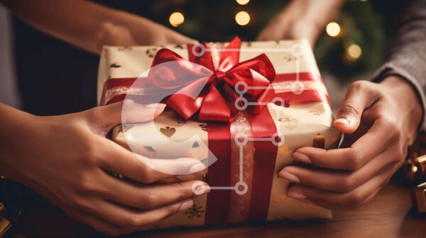 Intra Συλλεκτικό Ξύλινο Παζλ Plywood 4mm – Χέρια που κρατούν ένα χριστουγεννιάτικο κουτί δώρου με κόκκινη κορδέλα και διακοσμητικά Σε Ξύλινο Κουτί – Διαστάσεις: 10×10 cm – 25 κομμάτια