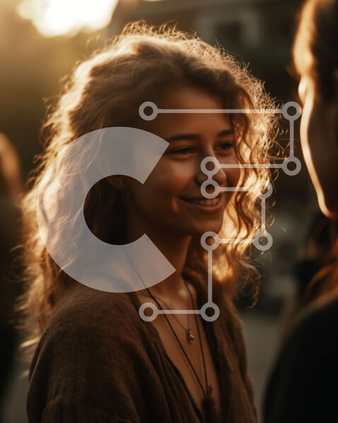 Intra Συλλεκτικό Ξύλινο Παζλ Plywood 4mm – Χαμογελαστή γυναίκα με καφέ πουλόβερ που στέκεται στο πλήθος κατά το ηλιοβασίλεμα Σε Ξύλινο Κουτί – Διαστάσεις Puzzle: 10×10 cm – 25 κομμάτια