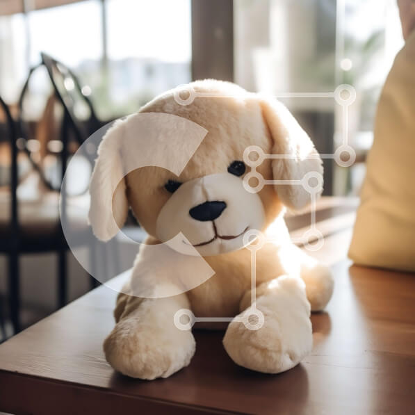 Intra Συλλεκτικό Ξύλινο Παζλ Plywood 4mm – Χαρούμενος και παιχνιδιάρης γεμιστός σκύλος σε ξύλινο τραπέζι Σε Ξύλινο Κουτί – Διαστάσεις Puzzle: 10×10 cm – 25 κομμάτια