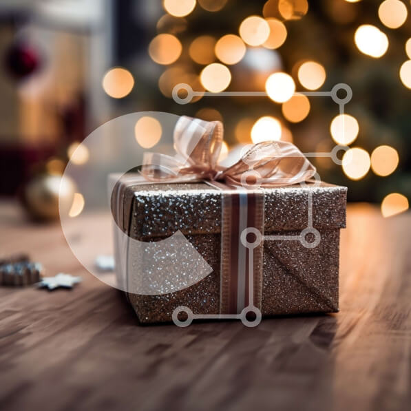 Intra Συλλεκτικό Ξύλινο Παζλ Plywood 4mm – Χρυσό κουτί δώρου με φιόγκο σε ξύλινο τραπέζι μπροστά από χριστουγεννιάτικο δέντρο με φωτάκια Σε Ξύλινο Κουτί – Διαστάσεις: 10×10 cm – 25 κομμάτια