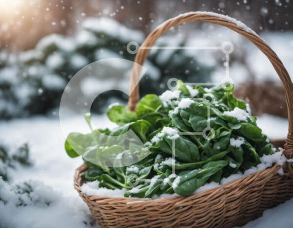 Intra Συλλεκτικό Ξύλινο Παζλ Plywood 4mm – Ψάθινο καλάθι με φρέσκα φύλλα σπανακιού στο χιόνι Σε Ξύλινο Κουτί – Διαστάσεις: 10×10 cm – 25 κομμάτια
