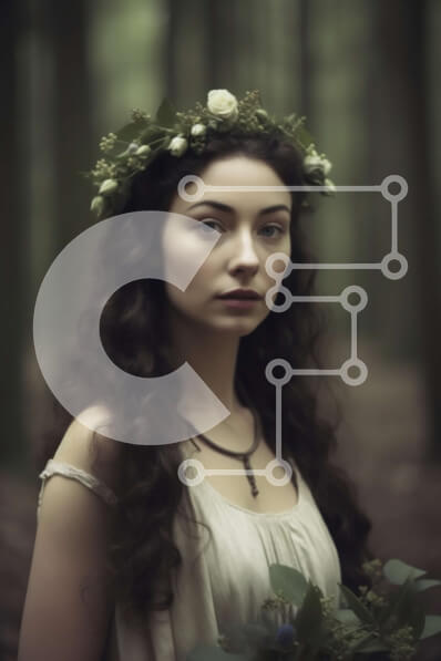 Intra Συλλεκτικό Ξύλινο Παζλ Plywood 4mm – Όμορφη γυναίκα με στέμμα λουλουδιών που περιβάλλεται από δέντρα και φύλλωμα Σε Ξύλινο Κουτί – Διαστάσεις: 10×10 cm – 25 κομμάτια