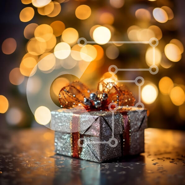 Intra Συλλεκτικό Ξύλινο Παζλ Plywood 4mm – Όμορφη εικόνα ενός ασημένιου κουτιού δώρου με φιόγκο στο τραπέζι μπροστά από το χριστουγεννιάτικο δέντρο Σε Ξύλινο Κουτί – Διαστάσεις: 10×10 cm – 25 κομμάτια