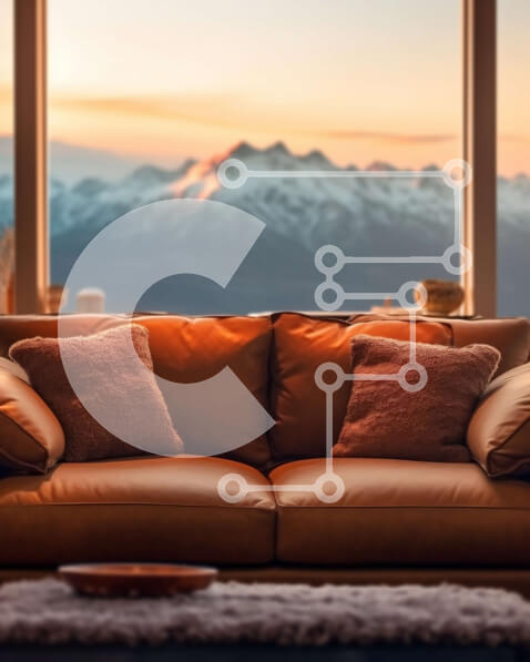 Intra Συλλεκτικό Ξύλινο Παζλ Plywood 4mm – Όμορφη θέα στο ηλιοβασίλεμα από καφέ δερμάτινο καναπέ από μεγάλο παράθυρο Σε Ξύλινο Κουτί – Διαστάσεις Puzzle: 10×10 cm – 25 κομμάτια