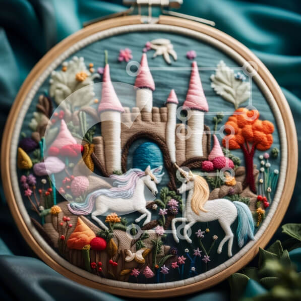 Intra Συλλεκτικό Ξύλινο Παζλ Plywood 4mm – Όμορφη κεντημένη εικόνα ενός μονόκερου σε ένα δάσος με φόντο το κάστρο Σε Ξύλινο Κουτί – Διαστάσεις Puzzle: 10×10 cm – 25 κομμάτια