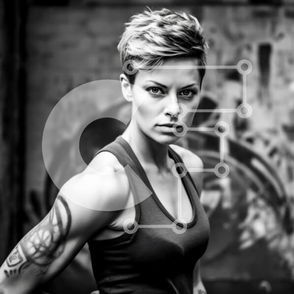 Intra Συλλεκτικό Ξύλινο Παζλ Plywood 4mm – Sporty and edgy look: Γυναίκα με κοντά μαλλιά και τατουάζ μπροστά στον τοίχο του γκράφιτι Σε Ξύλινο Κουτί – Διαστάσεις: 10×10 cm – 25 κομμάτια